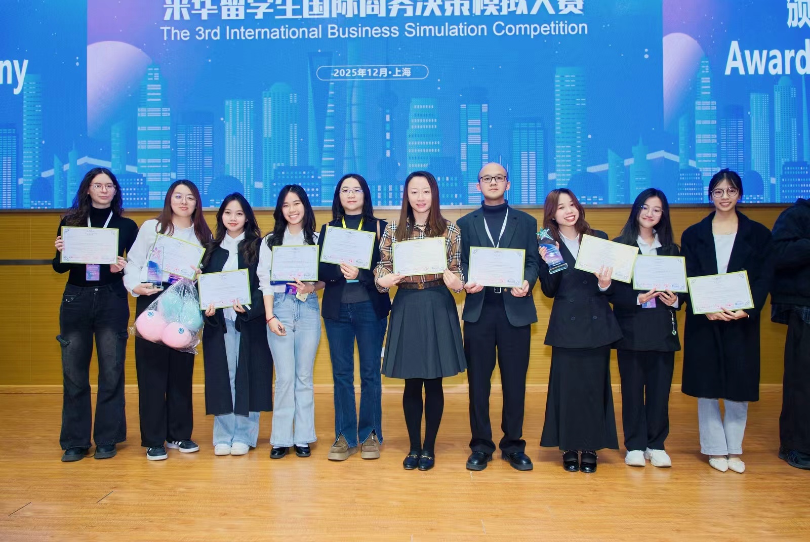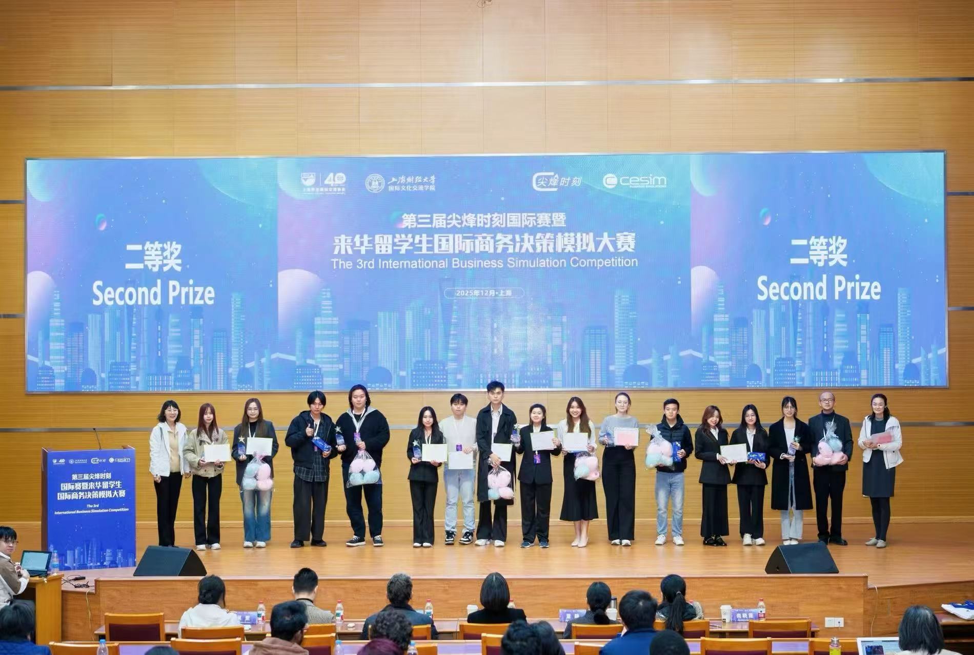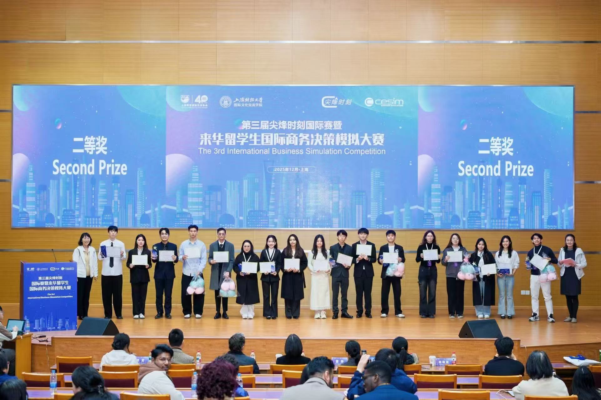 2025年12月3日,第三届来华留学生国际商务决策模拟大赛暨尖烽时刻国际赛总决赛在上海财经大学落下帷幕。我校国际学生组织2支队伍报名参赛,经过40余天的精心备赛和多回合预赛,由张娟、朱青两位老师指导的2支队伍双双晋级决赛,并凭借扎实的专业功底与出色的团队协作,在来自全国25所院校的33支决赛队伍中脱颖而出,最终斩获二等奖。这是我校国际学生在该大赛中第二次获奖。