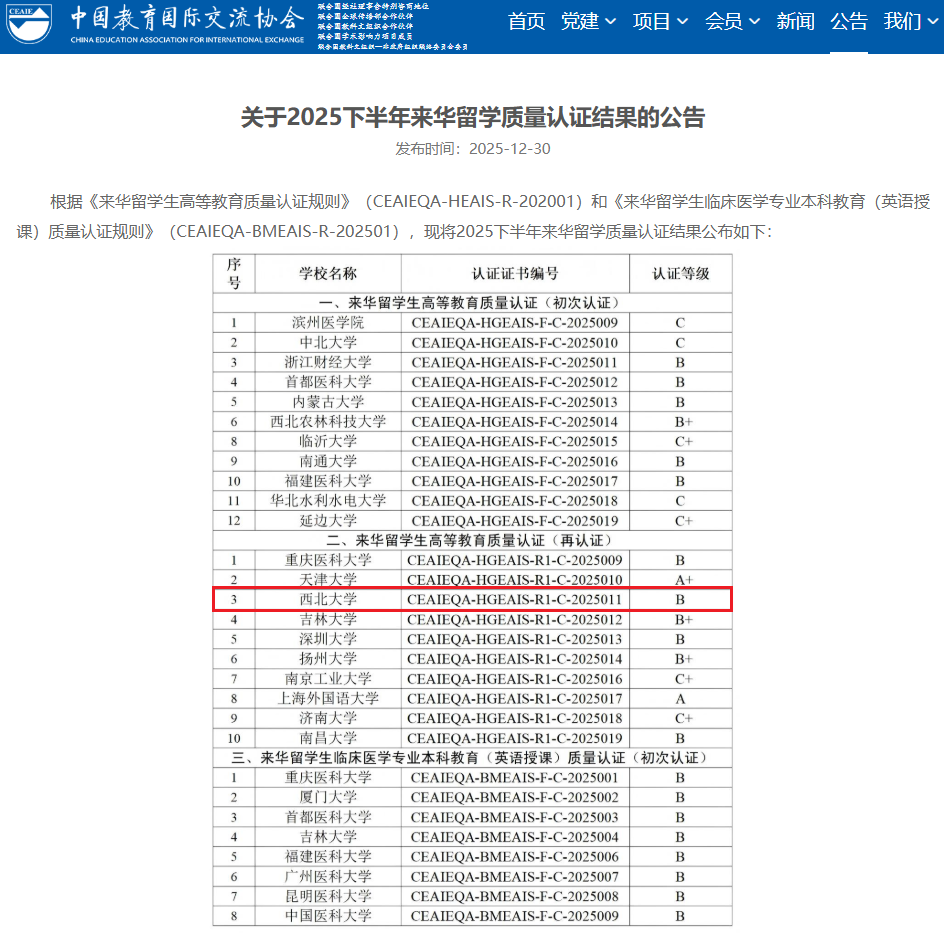 日前,中国教育国际交流协会发布关于2025下半年来华留学质量认证结果的公告。我校顺利通过来华留学生高等教育质量再认证,获得“B级”认证,认证有效期为6年,在参加质量再认证的陕西高校中位列前三。为做好此次来华留学生高等教育质量再认证,学校构建了由校领导牵头、21个职能部门和24个培养院系协同参与的两级工作体系,强化组织保障。严格对标认证指标,高质量完成9万字自评报告和900余页支撑材料,全面梳理办学成效与特色...